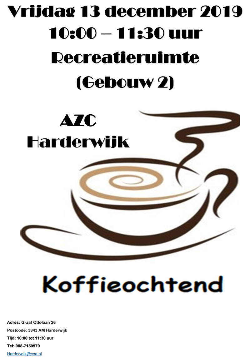 Het AZC en haar bewoners nodigen u op vrijdag 13 december uit van 10:00 tot 11:30 uur om een kop koffie of thee te komen drinken tijdens de maandelijkse koffieochtend op het AZC in Harderwijk.
